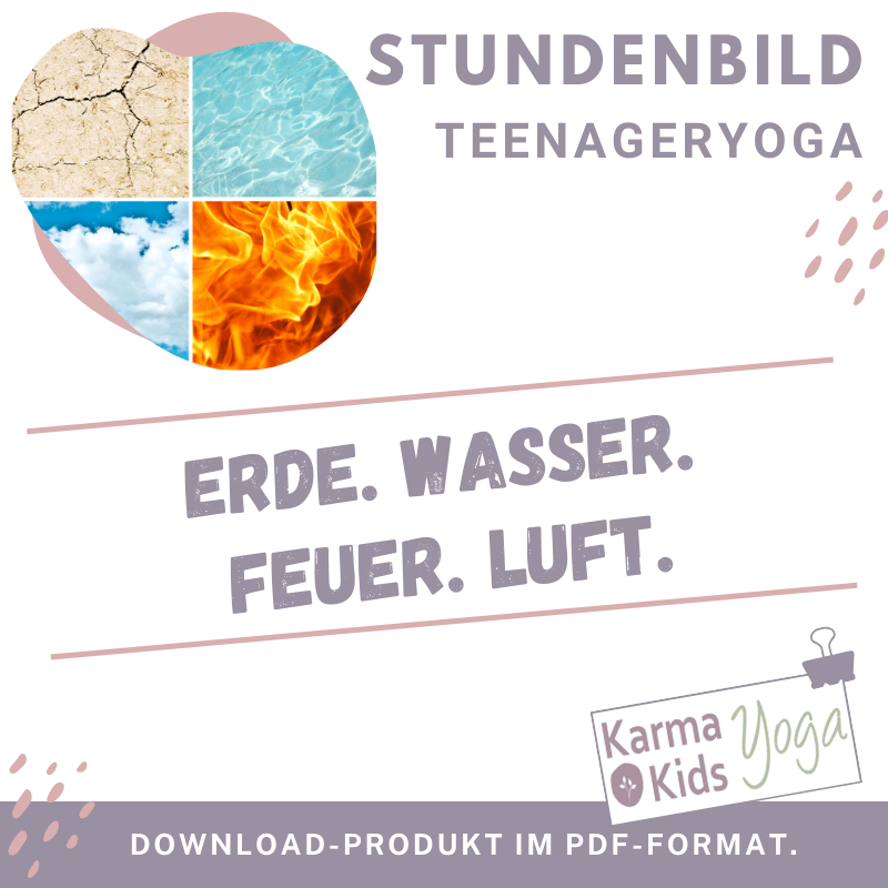 Dieses Stundenbild für Jugendliche ab ca. 14 Jahren verbindet die vier Elemente Erde, Wasser, Feuer und Luft mit der Yogapraxis und lädt dazu ein, innere Ruhe, Stärke und Balance zu finden. Inspiriert durch die Qualitäten und Eigenschaften der 4 Elemente lassen wir das Gedankenkarussell zur Ruhe kommen, entfachen mit kraftvollen Asana-Sequenzen unser inneres Feuer, üben erdende Asana und Mudra – Flows und Entspannen mit dem Element Wasser.