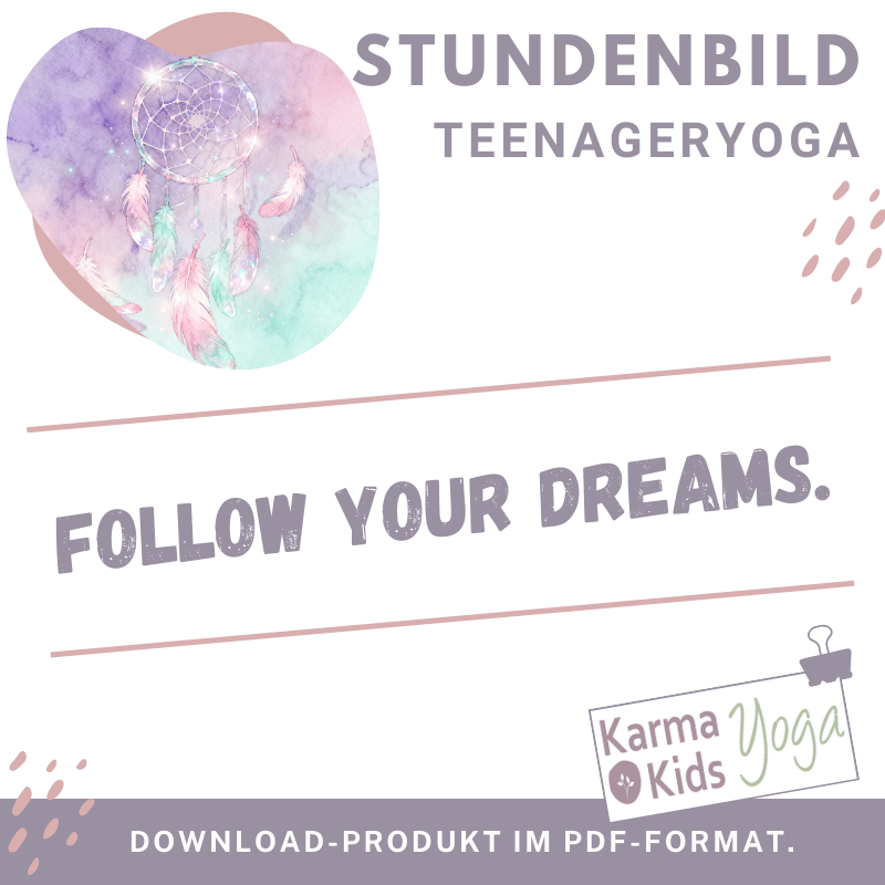 Dieses Stundenbild für Jugendliche ab 9 Jahren bietet die Gelegenheit, Yoga mit einem kraftvollen und inspirierenden Thema zu verbinden: Träume und Visionen. In der Yogastunde „Follow your Dreams“ lernen Jugendliche, wie wichtig es ist, Träume zu haben und an sie zu glauben. Sie entdecken ihre eigenen Visionen und visualisieren diese auf spielerische und achtsame Weise. Die Yogastunde beginnt mit einer sanften Atemübung, die den Geist beruhigt und die Jugendlichen auf das Thema „Träume“ einstimmt. Mit dem Sonnengruß bereiten sich die Jugendlichen auf die Yogapraxis vor und tanken Energie. Die Asana-Sequenzen sind passend zum Thema Träume gestaltet und fördern Konzentration, Balance und ein Gefühl von Leichtigkeit. Spielerische Elemente laden die Jugendlichen dazu ein, kreativ mit ihren Träumen zu arbeiten. Sie setzen sich achtsam mit ihren Visionen auseinander und lernen, diese durch Visualisierungen zu stärken. In einer geführten Entspannung am Ende der Yogastunde in Shavasana werfen die Jugendlichen einen Blick in ihre Zukunft, voller Zuversicht und Mut, ihre Träume zu verfolgen.